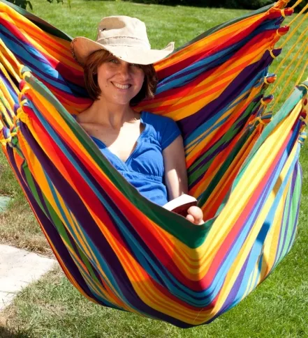 Lazy Creme as Hängesessel Gestell Lazy ist mit der Farbe Creme besonders edel. Wie jedes MacaMex Hängematten / Hängesessel Produkt wird auch dieses Gestell mit größter sorgfalt hergestellt. Es ist von 200 - 240cm höhen verstellbar und erlaubt eine geprüfte Tragkraft von 130kg. Während andere Gestelle weiss, grau oder blau sind, wird dieses Gestell mit einer hochwertigen wetterfesten Pulverbeschichtung in Creme produziert. Sicherheitsfüsse sorgen für einen besonders stabilen Stand.DatenStandfläche Breite / Tiefe 115 x 130 cmHöhenverstellbar von 200 - 240 cmGewicht: 19 kgTragkraft 130 kgGarantie 24 MonateFarbe CremeWetterfestCayo Gigante Paradiso MacaTex ayo Gigante Paradiso MacaTex with a wooden bar of 140 cm length and a lying surface of 210 cm is actually gigantic big and a real alternative to a hammock. Made of MacaTex this hanging chair resists perfectly against mold, sun and snow. Due to the material colors will stay vivid for a very long time. Here you can relax without feeling hemmed in it. Space really is no issue in this hanging chair. You even can expand your feet without problems. This normally only is true for net hanging seats. The wooden bar consists of Chilean jaw. The dark brown is classy and top quality. It is handmade and fits ideally to the colorful fabric. Since this big hanging chair is made of the weatherproof MacaMex material you can perfectly enjoy a siesta in it in the garden and let him hang outdoors also.